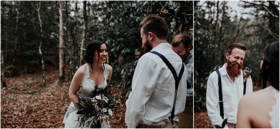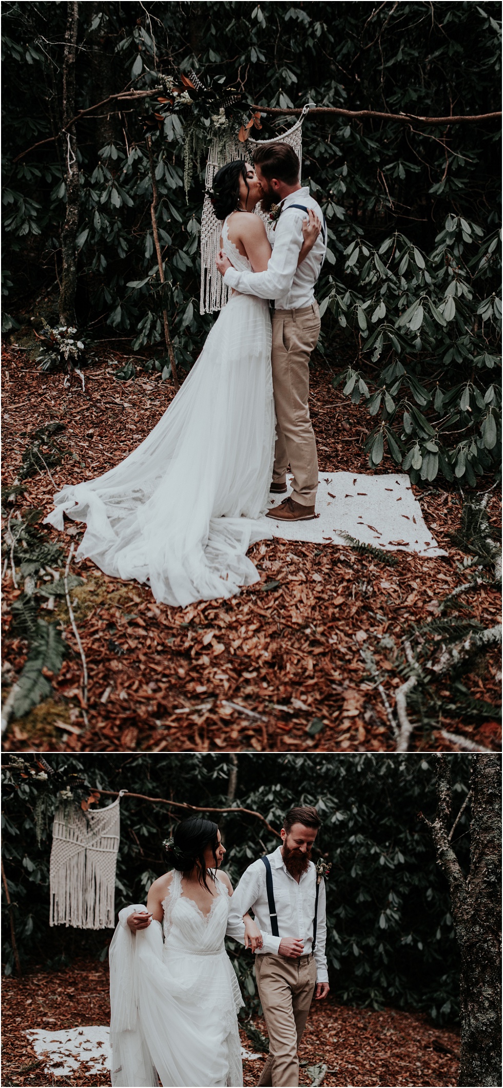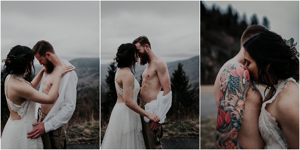 If you know anything about us then you know we’re WAY into elopements in the middle of the woods. Especially if it’s on the Blue Ridge Parkway, around Asheville. Stephanie from Little Wild Bloom floated the idea for a styled shoot and we were really into it. We teamed up with some incredible vendors and made it happen. There was a macrame hanging for the ceremony site. We made an aisle out of sticks and ferns. Josh helped Melissa get dressed. During the ceremony portion Melissa teared up while telling Josh why she loves him. Josh spun her around on the parkway in gorgeous light. He helped her across a creek and gave her bear hugs. She took his shirt off and admired his muscles. Together they are an incredible, wildly in love couple. It was one hell of an afternoon in Pisgah National Forest. They’re getting married for real in October and we can’t wait to photograph it!